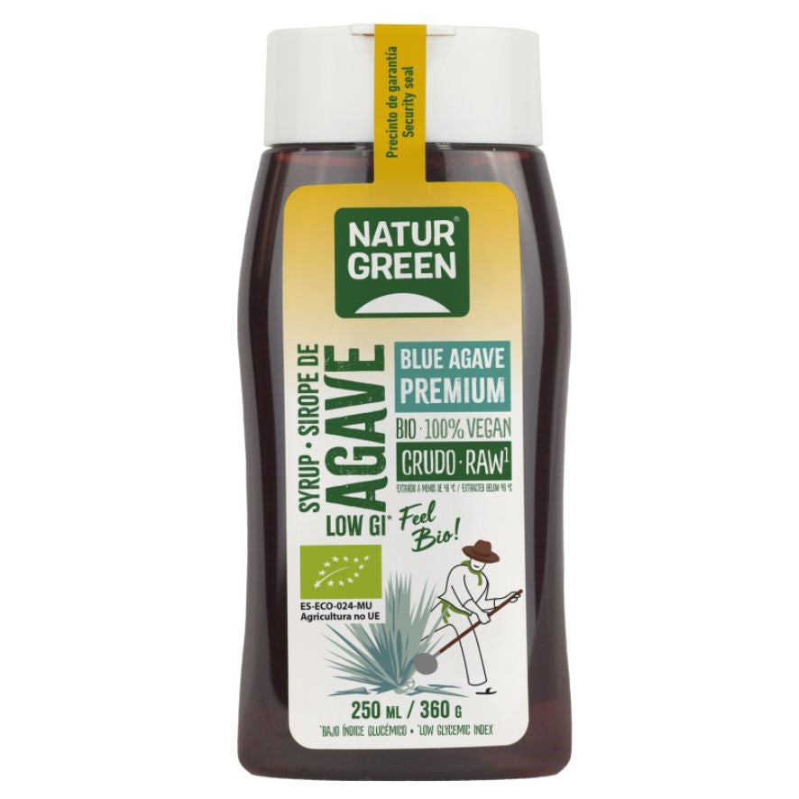 Sirope de Agave Crudo Azul Bio 250ml. Jugo vegetal dulce que se extrae de sus hojas o pencas. De aspecto parecido a una yuca o  de un cactus, pero en realidad es una suculenta similar al aloe vera. Sin gluten certificado y de agricultura ecológica. Excelente potenciador del sabor y del aroma. De bajo índice glucémico.
