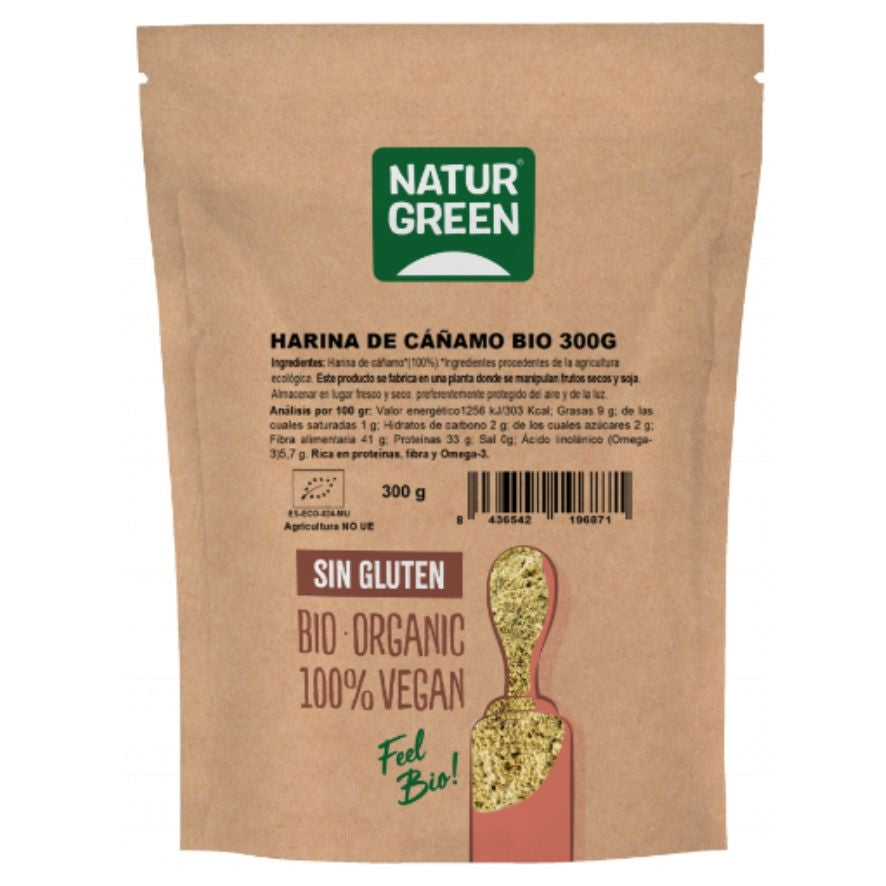 Harina de Cáñamo Bio 300g NaturgreenSin gluten, adecuada para hornear y otras aplicaciones de cocina. Se puede utilizar para espesar salsas, o para añadir a otras harinas. Normalmente puede reemplazar el 25% de harina.