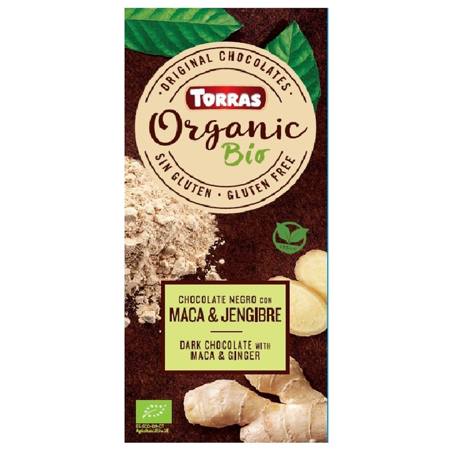 Chocolate Negro con Maca y Jengibre Bio 100g Torras. Elaborado 100%mediante ingredientes de agricultura ecológica, sin gluten certificado y endulzado con azúcar de caña. Apto para dietas veganas.