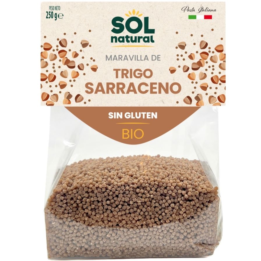 Pasta Maravilla de Trigo Sarraceno Sin Gluten Bio 250g Sol Natural. De sabor terroso y textura firme, ideal para platos fríos o calientes. Ricos en nutrientes como proteínas, fibra, antioxidantes y minerales como magnesio y manganeso. Opción nutritiva para promover la energía y el bienestar cardiovascular.