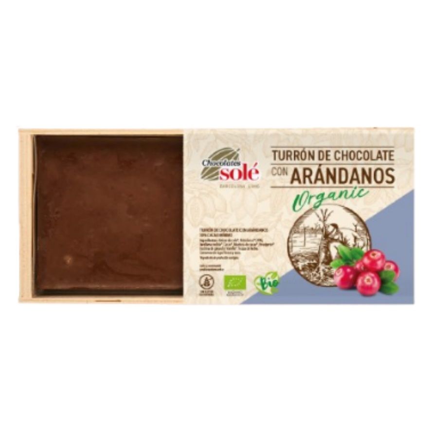 Turrón de Chocolate con Arándanos Bio Fairtrade 200g Chocolates Solé. Con ingredientes 100% de agricultura ecológica y de Comercio Justo. Delicioso al paladar y apto para celíacos. ¡Ideal para estas fiestas de Navidad! Sin lactosa y apto para dietas veganas.