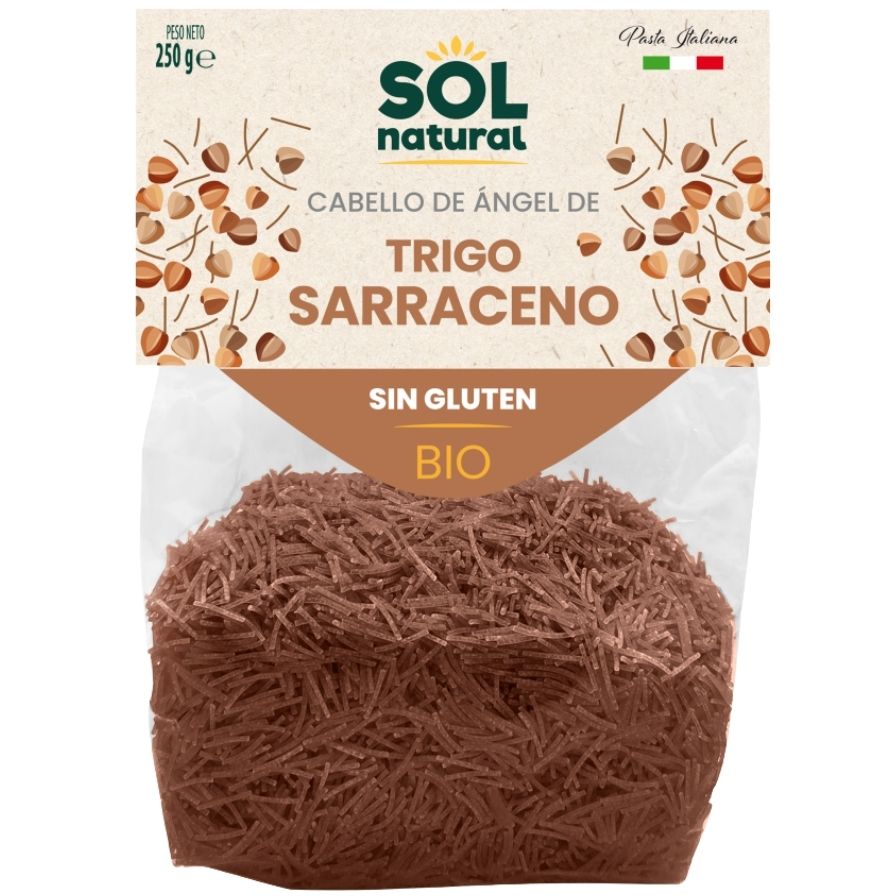 Cabello de Ángel de Trigo Sarraceno Sin Gluten Bio 250g Sol Natural. De sabor terroso y textura firme, ideal para platos fríos o calientes. Ricos en nutrientes como proteínas, fibra, antioxidantes y minerales como magnesio y manganeso. Opción nutritiva para promover la energía y el bienestar cardiovascular.